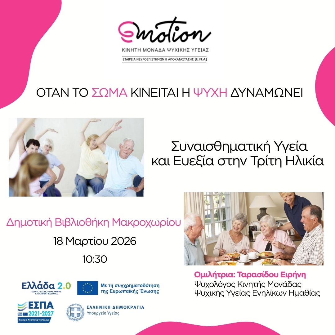 📣Την Τέταρτη 18 Μαρτίου, στις 10:30 θα πραγματοποιηθεί εκδήλωση με θέμα «Όταν το σώμα κινείται η ψυχή δυναμώνει» στην Δημοτική Βιβλιοθήκη Μακροχωρίου στην οποία η ψυχολόγος της Κινητής Μονάδας Ψυχικής Υγείας, κα Ταρασίδου, θα μιλήσει για την «Συναισθηματική υγεία και ευεξία στην τρίτη ηλικία».