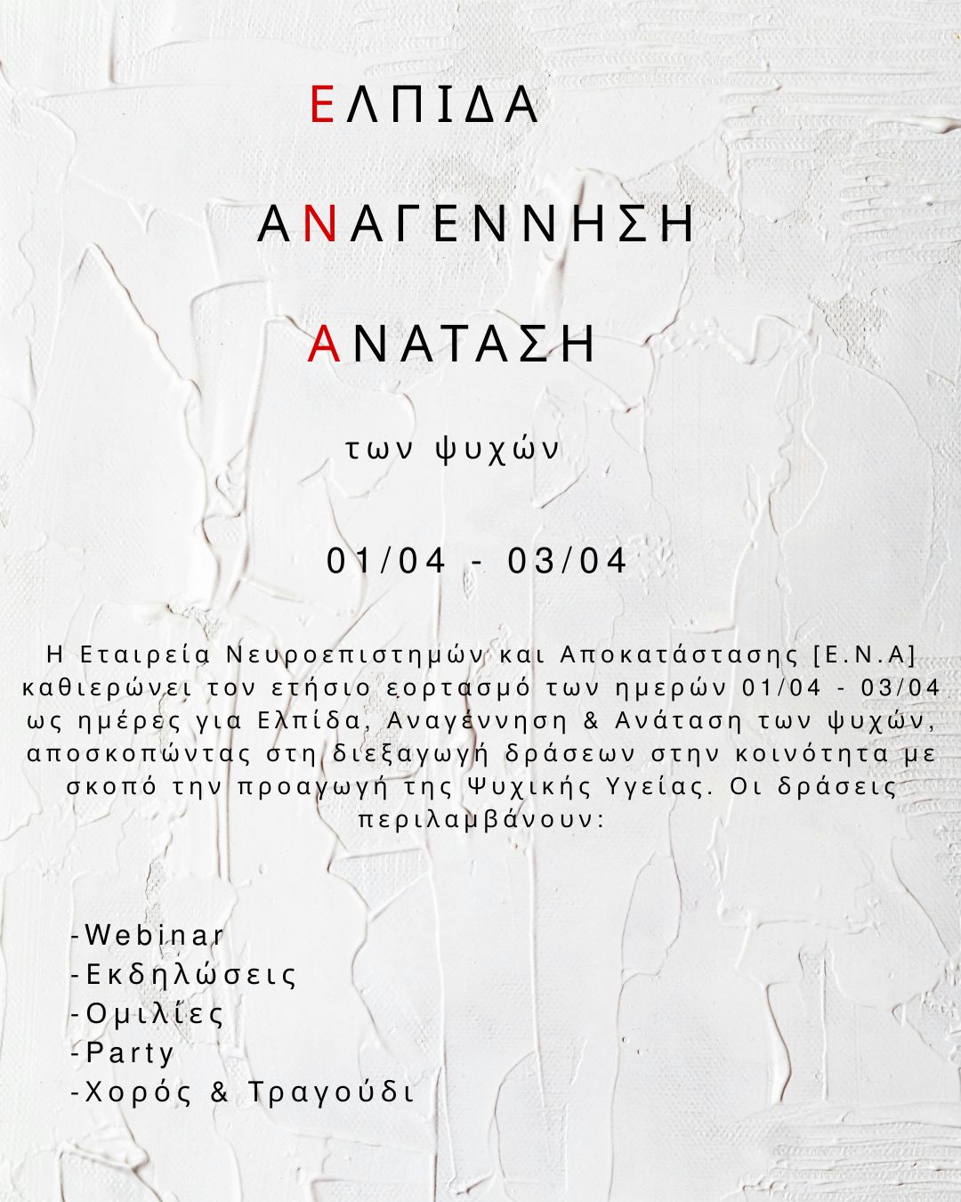 Η πρωτοβουλία της Εταιρείας Νευροεπιστημών και Αποκατάστασης [Ε.Ν.Α] να καθιερώσει τον ετήσιο εορτασμό των ημερών 01/04 – 03/04 ως ημέρες για Ελπίδα, Αναγέννηση & Ανάταση των ψυχών, αποσκοπεί στη  διεξαγωγή δράσεων στην κοινότητα με σκοπό την προαγωγή της Ψυχικής Υγείας.