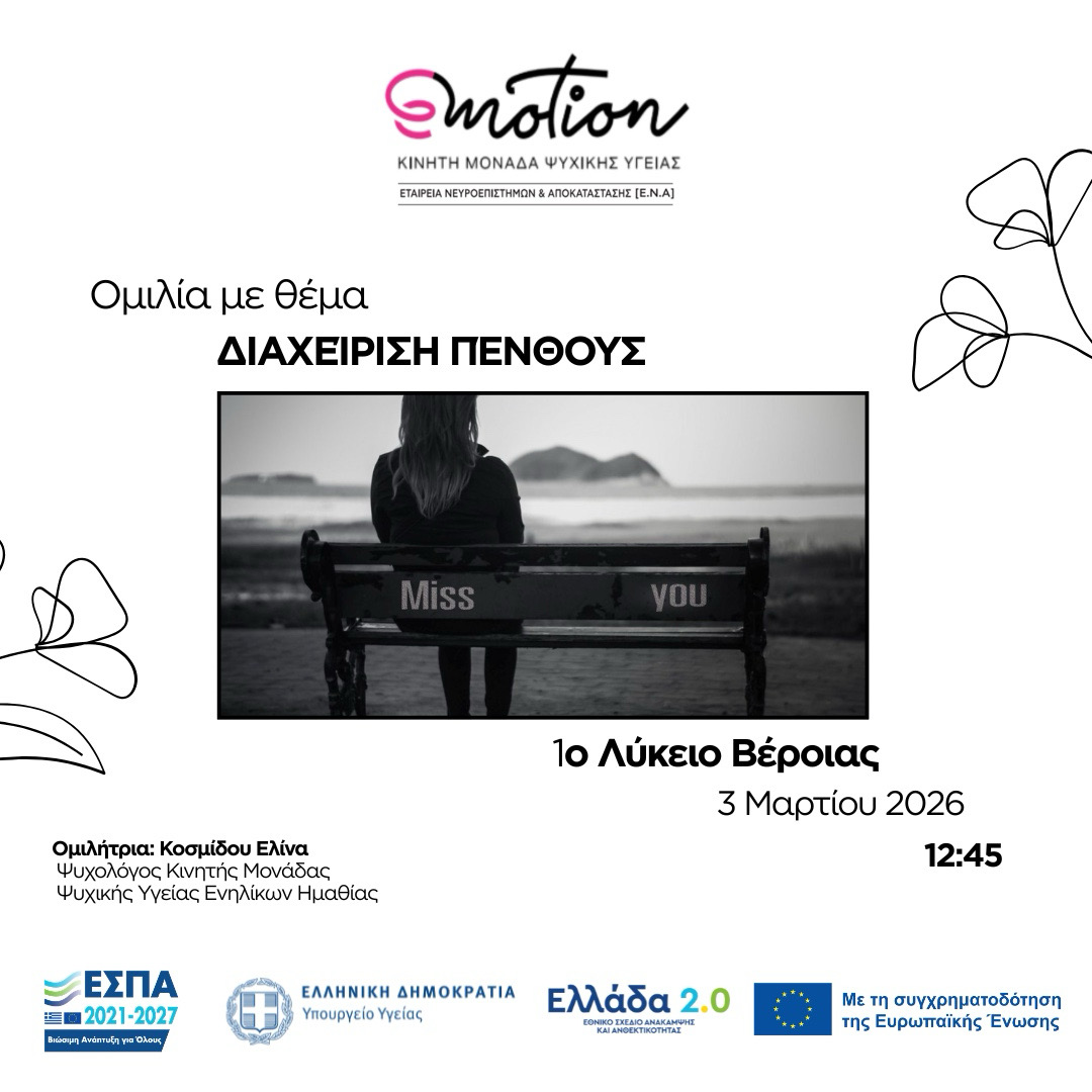 Ομιλία με θέμα «Διαχείριση πένθους» στο 1ο Λύκειο Βέροιας Categorized in: Κινητή Μονάδα Ψυχικής Υγείας Ημαθίας Posted on: 2 Μαρτίου 2026 Last updated on: 2 Μαρτίου 2026 Written by: KmpsyEna Την Τρίτη 3 Μαρτίου στις 12:45 θα πραγματοποιηθεί ομιλία με θέμα «Διαχείριση πένθους» στο 1ο Λύκειο Βέροιας. Skip back to main navigation