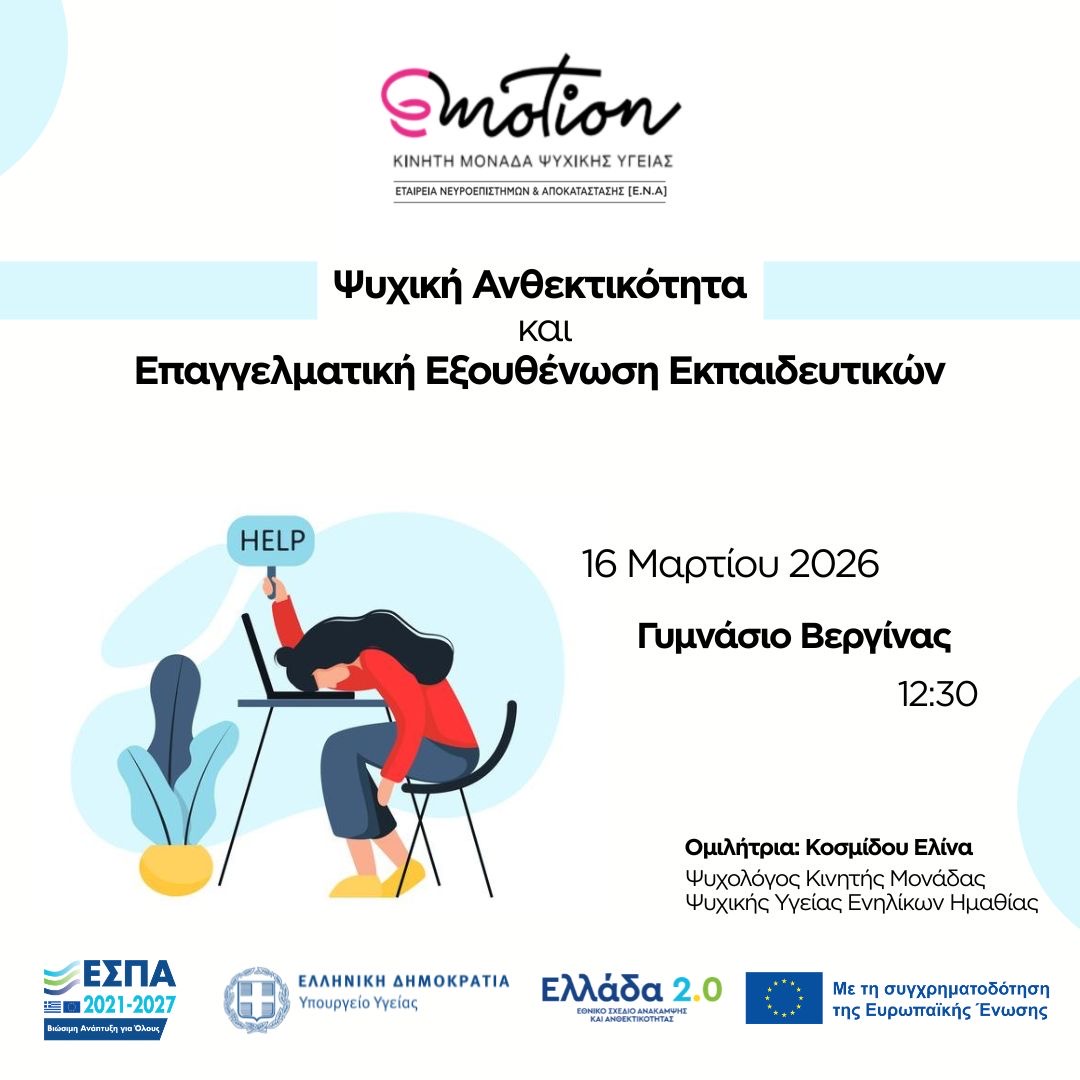 📣Την Δευτέρα 16 Μαρτίου, στις 12:30, θα πραγματοποιηθεί ομιλία με θέμα «Ψυχική Ανθεκτικότητα και Επαγγελματική Εξουθένωση Εκπαιδευτικών» στο Γυμνάσιο Βεργίνας.